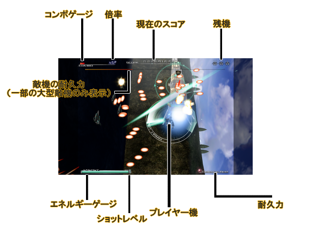 耐久力表示が赤の時に被弾すると、自機が撃破されて残機を一機失います。